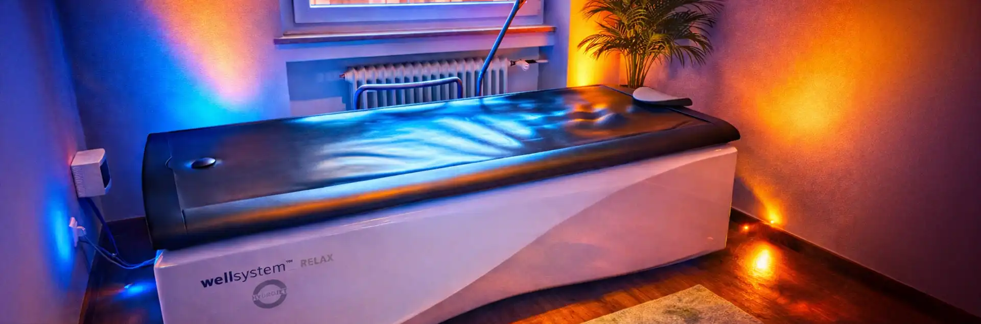 Stellen Sie sich vor, Sie liegen bequem auf angenehm temperiertem Wasser und werden von unsichtbaren Händen massiert! Sie spüren, wie ein warmer Wasserstrahl Ihre verspannten Muskeln kräftig walkt und sanft ausstreicht. Und das Beste dabei ist: Sie müssen sich nicht umziehen.